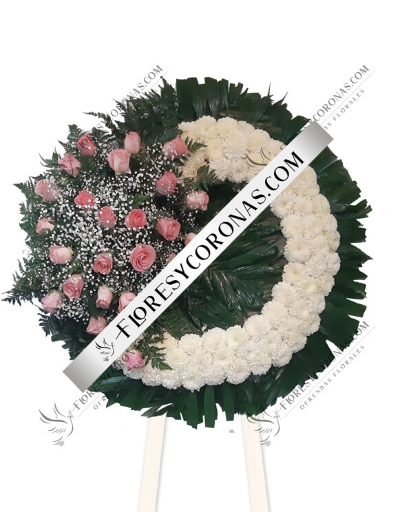 Corona en color blanco diseñada con 50 rosas blancas, baby breath, leather y palma.