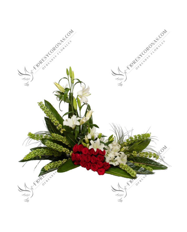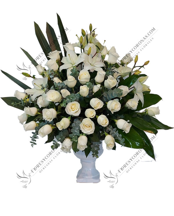 Arreglo en color blanco diseñado con rosas, lilis, dólar, espadas y leather.