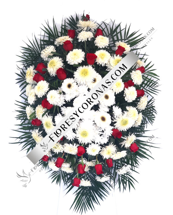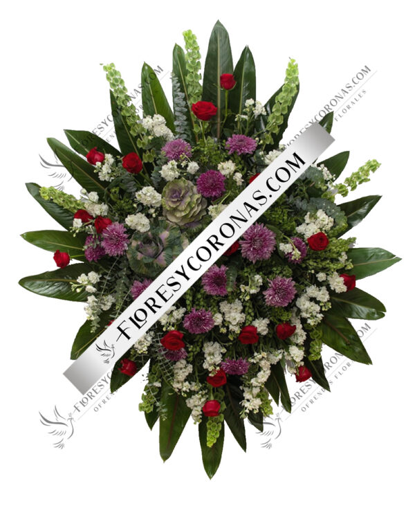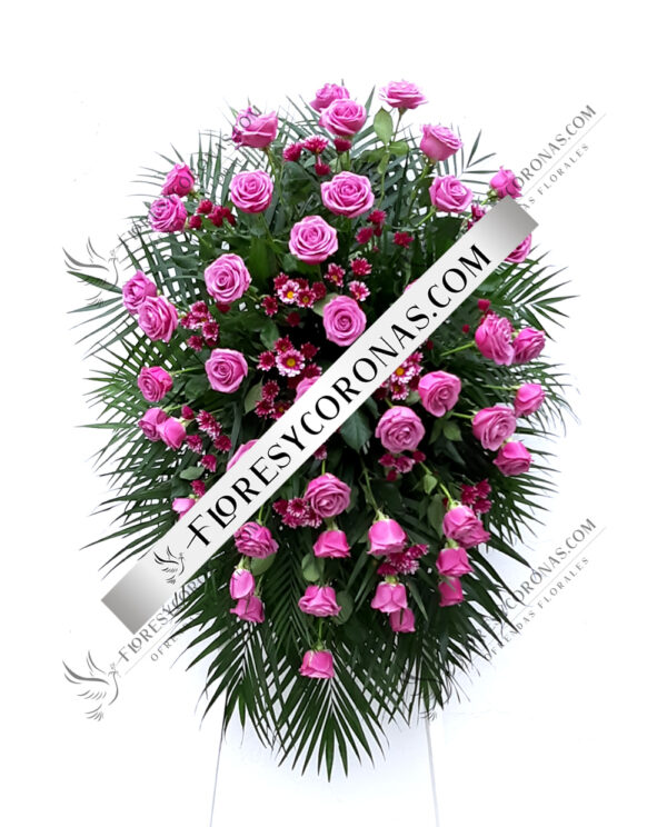 Medallon en tonos rosas diseñado con orquídeas, rosas, lilis, mini rosas, perritos, hoja de ave y palma.