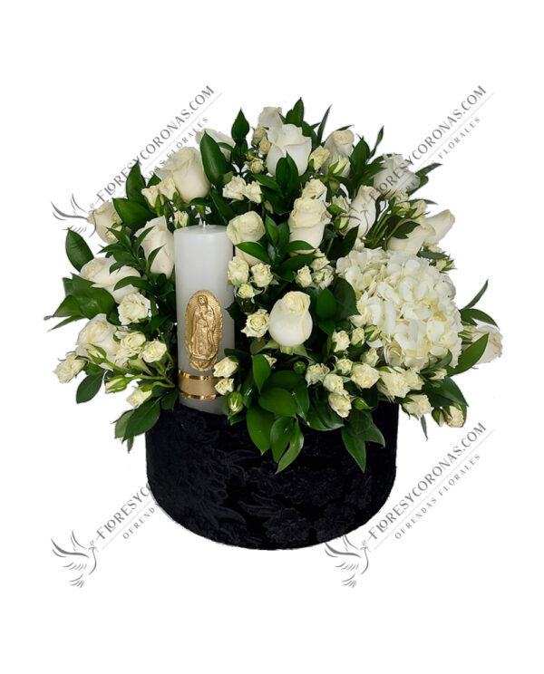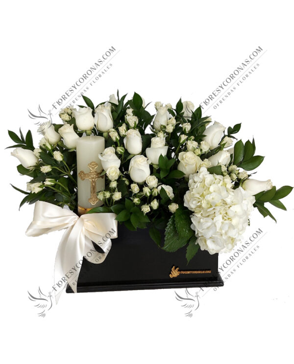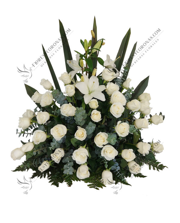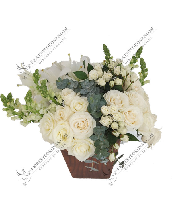 Arreglo en tonos blanco y rosa diseñado con rosas, lilis, hortensias, gladiolas, perritos, baby breath y leather.