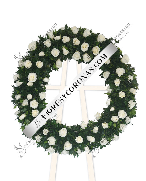 Corona en color blanco diseñada con gerberas, claveles, polar, baby breath, piñanola y palma.