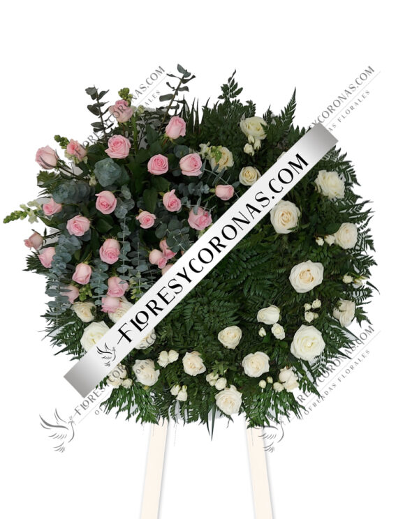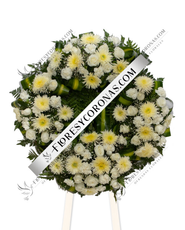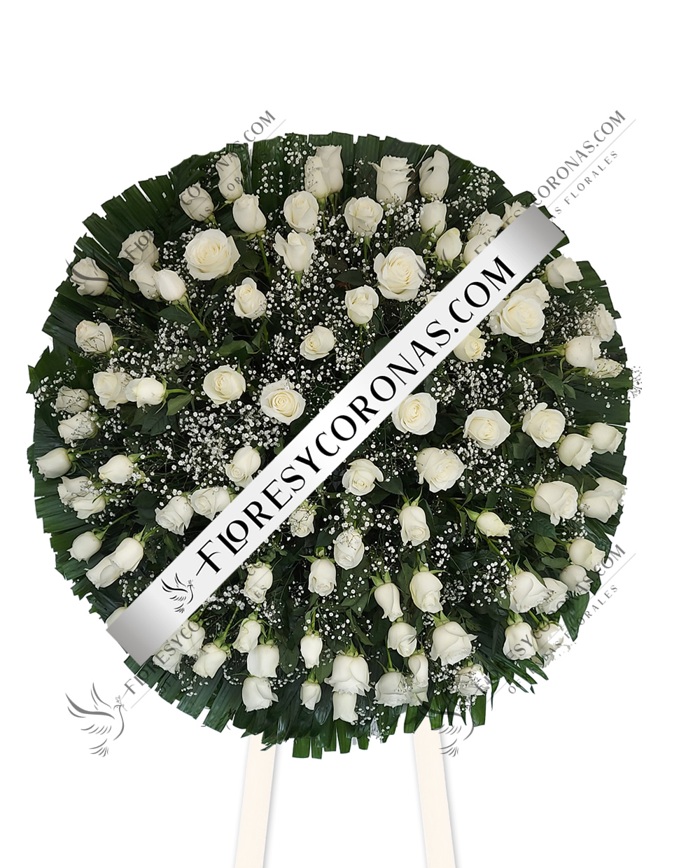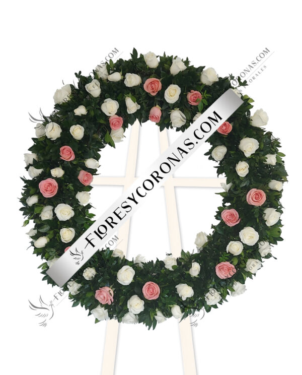 Corona con diseño especial elaborada con 100 rosas blancas, baby breath y follaje.