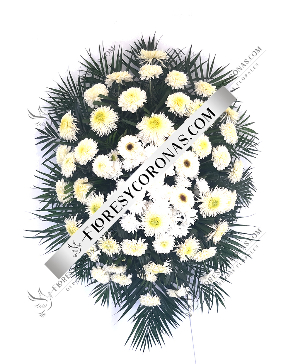 Medallón en color blanco elaborado con gerberas, polar, spider, margaritas y palma.