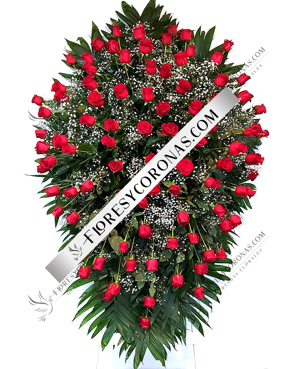 Medallón jumbo diseñado con 100 rosas, baby breath y follaje.